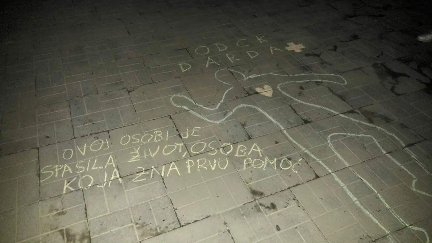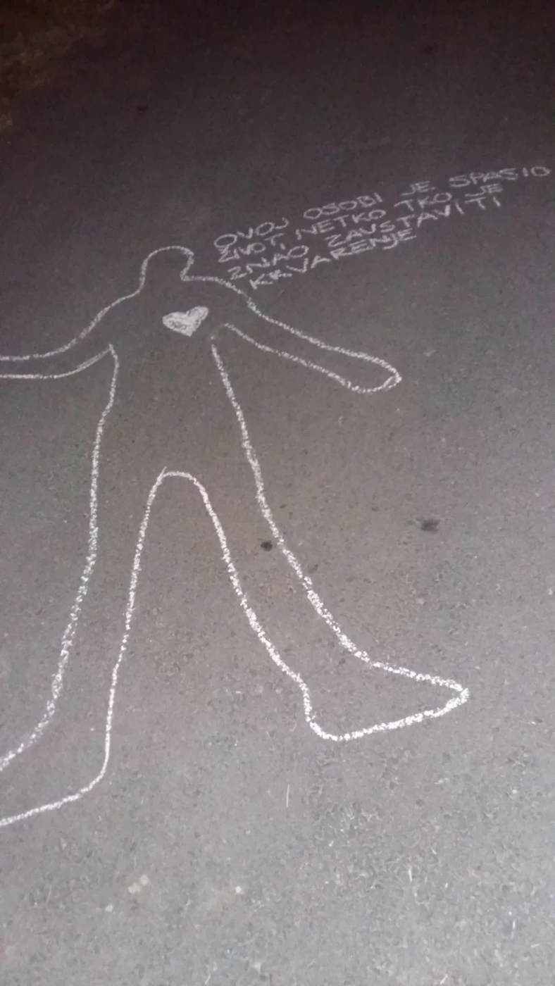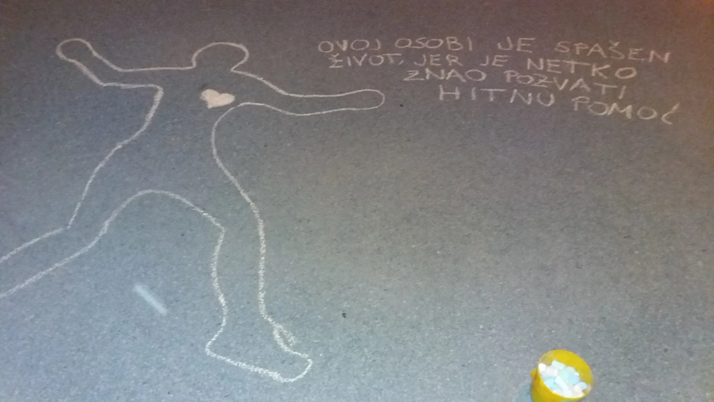 Na kolnicima, igralištima i parkiralištima, kredom su nacrtani obrisi ljudskih tijela uz koje su napisani određeni natpisi. Cilj ove aktivnosti bio je potaknuti ljude na volonterski rad te da si osvijeste vlastito znanje o prvoj pomoći i zašto je važno njezino poznavanje.