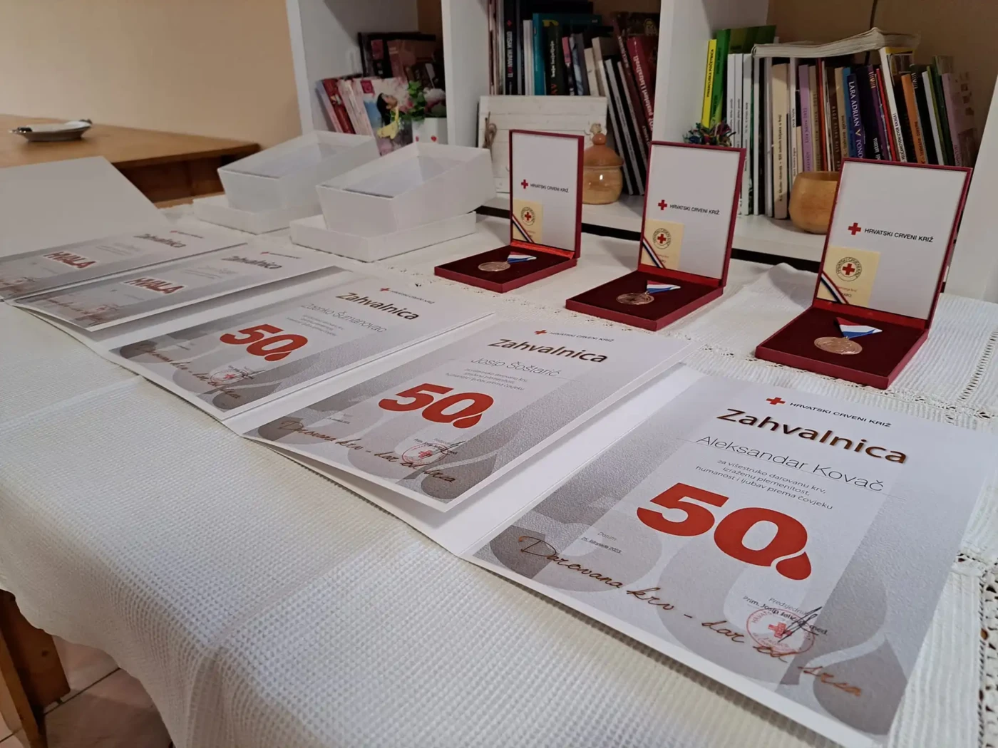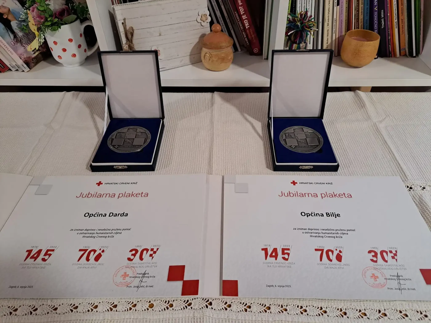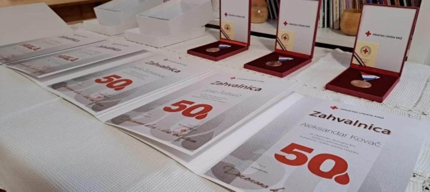 U prostorijama Crvenog križa Darda u Mecama, u petak, 27.10.2023. održana je dodjela zahvalnica za dobrovoljne darivatelje krvi povodom Dana dobrovoljnih darivatelja krvi u Republici Hrvatskoj. Ukupno je podijeljeno: dvije zahvalnice za 5 darivanja krvi, pet zahvalnica za 10 darivanja, četiri zahvalnice za 20 darivanja, jedna zahvalnica za 30 darivanja te tri zahvalnice za 40 darivanja krvi. Posebno ističemo darivatelje Aleksandra Kovača, Josipa Šoštarića i Zdenka Šumanovca koji su jučer primili priznanje i plaketu za 50. darivanje krvi te Ivicu Bajevića (ukupno 118 darivanja) i Zorana Štiglera (ukupno 50 darivanja) koji su primili završne zahvalnice i plakete za dobrovoljno darivanje krvi.