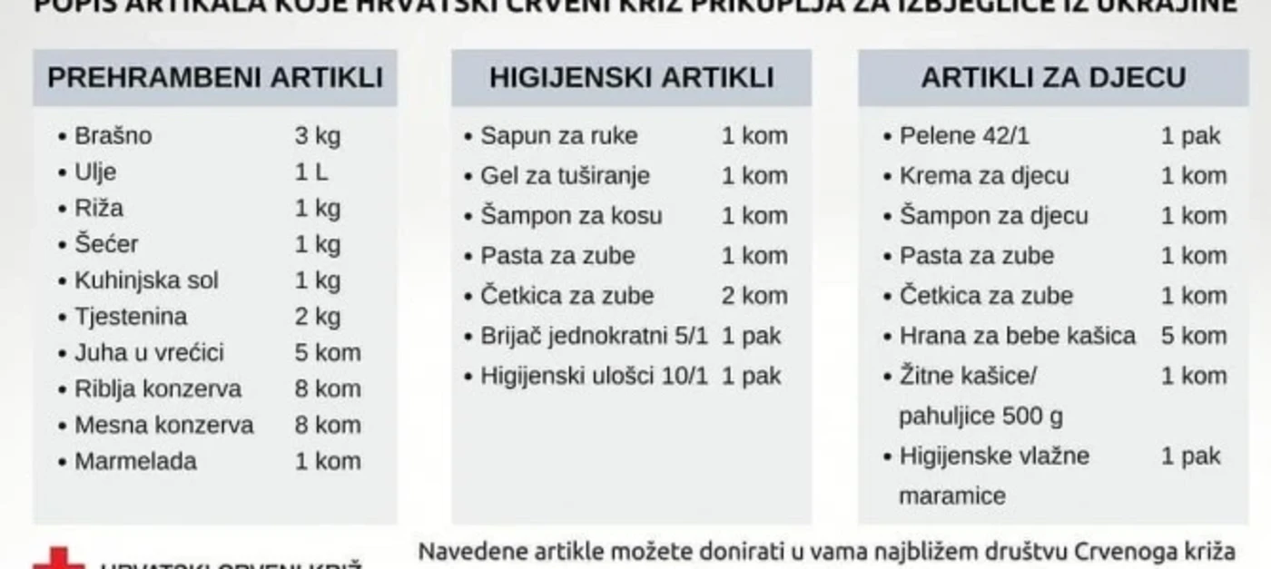Donacije se mogu donositi u prostorije Crvenog križa Darda, Sv. Ivana krstitelja 116 a svaki radni dan od 8 do 17 sati i subotom od 8 do 13 sati.